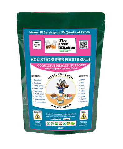 THE PETZ KITCHEN COGNITIVE SUPPORT* BROTH is further formulated to not only to help optimize your pet's nutrition in the form of critical probiotics, prebiotic fiber and digestive enzymes, but also Tri-Blend antioxidant super foods, fruits and herbs that are referred to as "brain food." The adaptogen herbs are highly specialized that are naturally coded with what we call the "3 R Function" or read, repair and restore function. This allows balance to be restored in the animal body, especially related to delicate transmission functions in the brain.