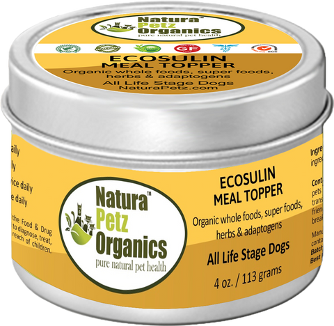 Our whole food, organic, flavored ECOSULIN MEAL TOPPER offers a convenient solution for pet-parents to “top off” their dog or cat’s nutrition to help encourage whole body balance and to optimize feline and canine health.